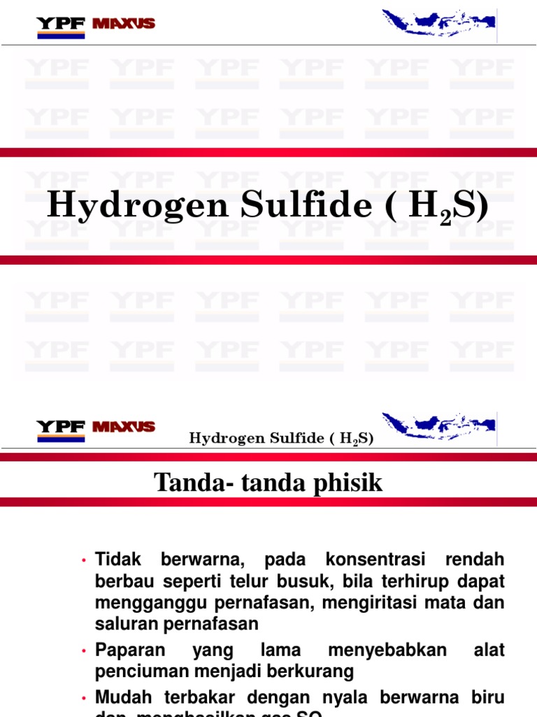 Flash point kurang dari 21C. Gas H2S adalah gas yang tidak berwarna beracun mudah terbakar dan berbau seperti telur busuk. H2S merupakan asam lemah terpisah dalam larutan aqueous mengandung air menjadi kation hidrogen H dan anion HS- menurut reaksi berikut.